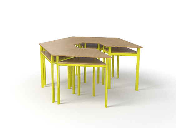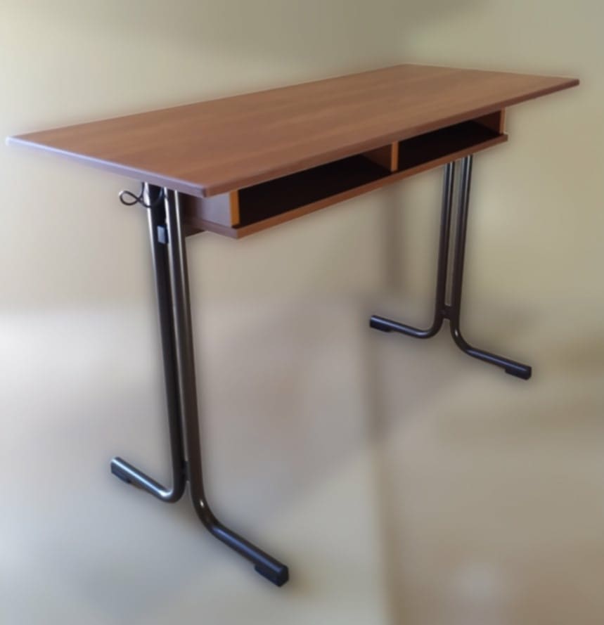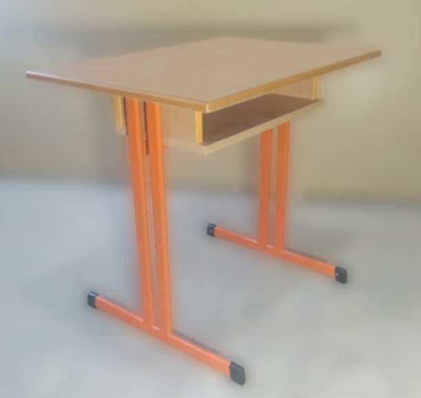 Anyaga 25x2mm húzott cső. Felülete kívánt színre szinterezve. Talpak padlóvédő műanyaggal vannak szerelve. Asztallap laminált bútorlap, ABS vagy PUR élzárással védettek.